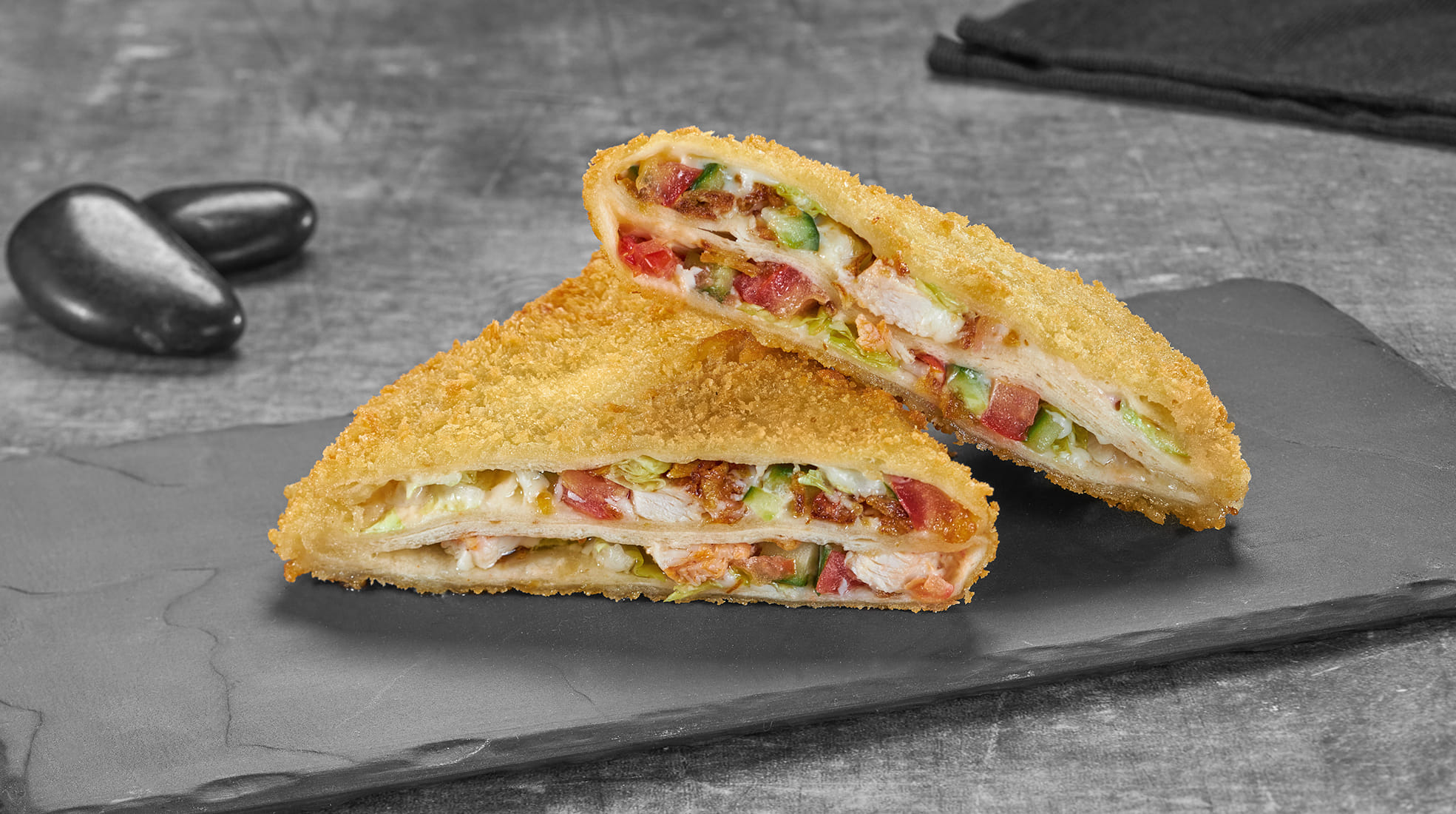 Курица, сыр пармезан, огурец, помидор, пекинская капуста, лук фри, тортилья, цезарь соус, темпурный кляр, панировочные сухари *Внешний вид блюда может отличаться от фото на сайте.