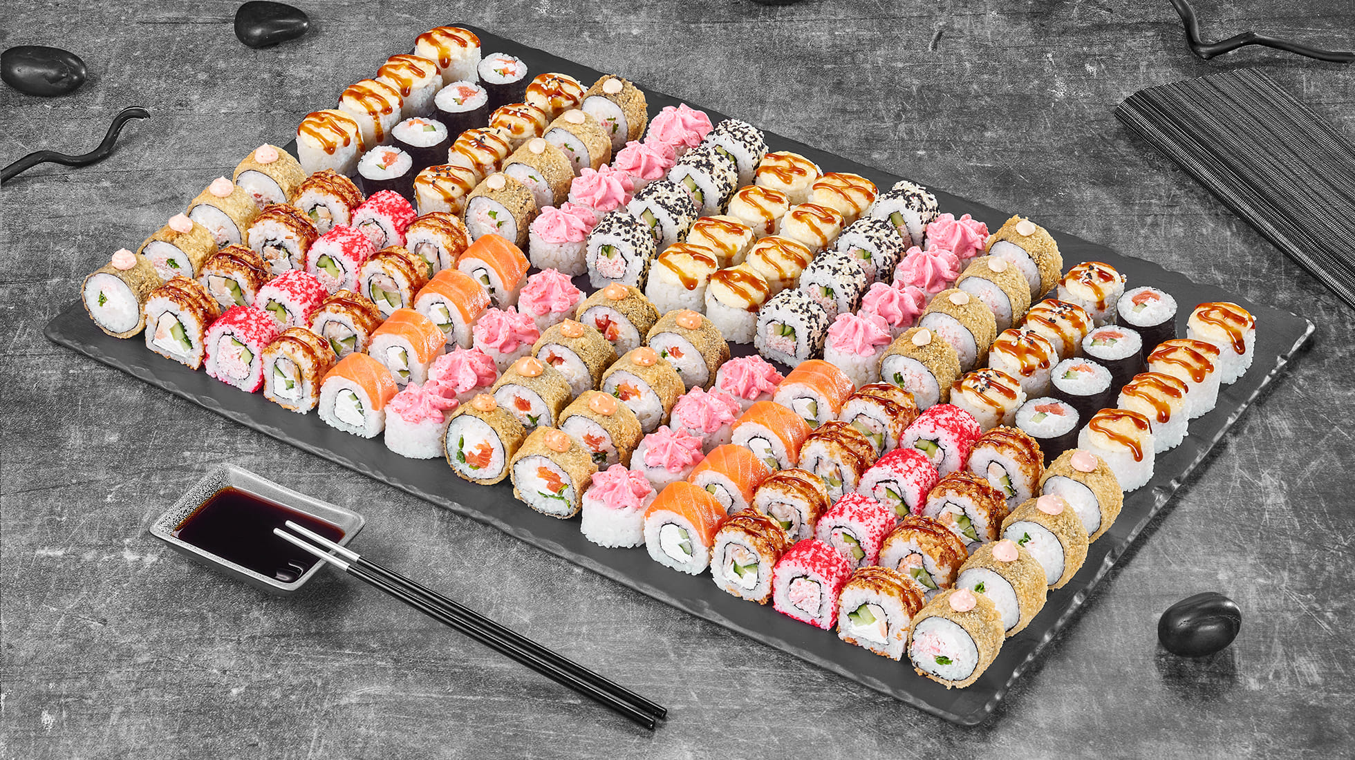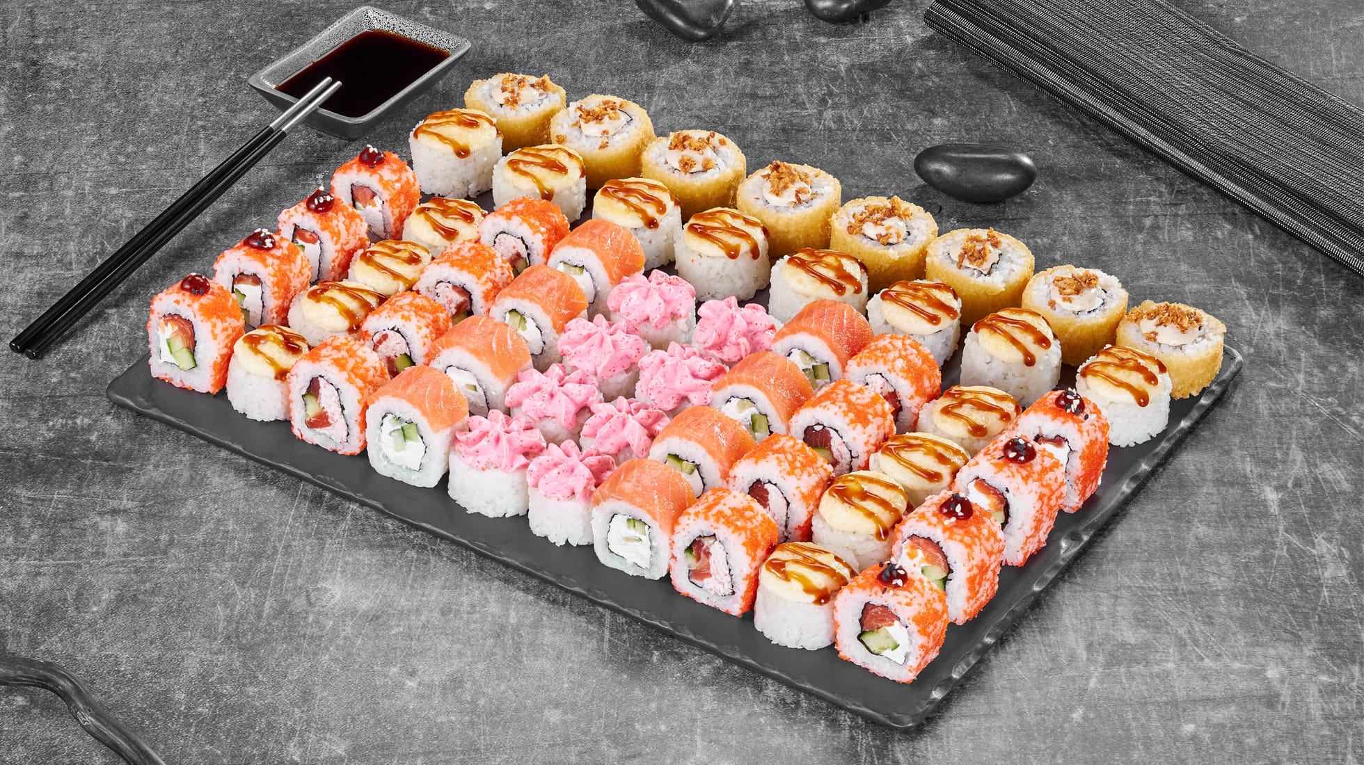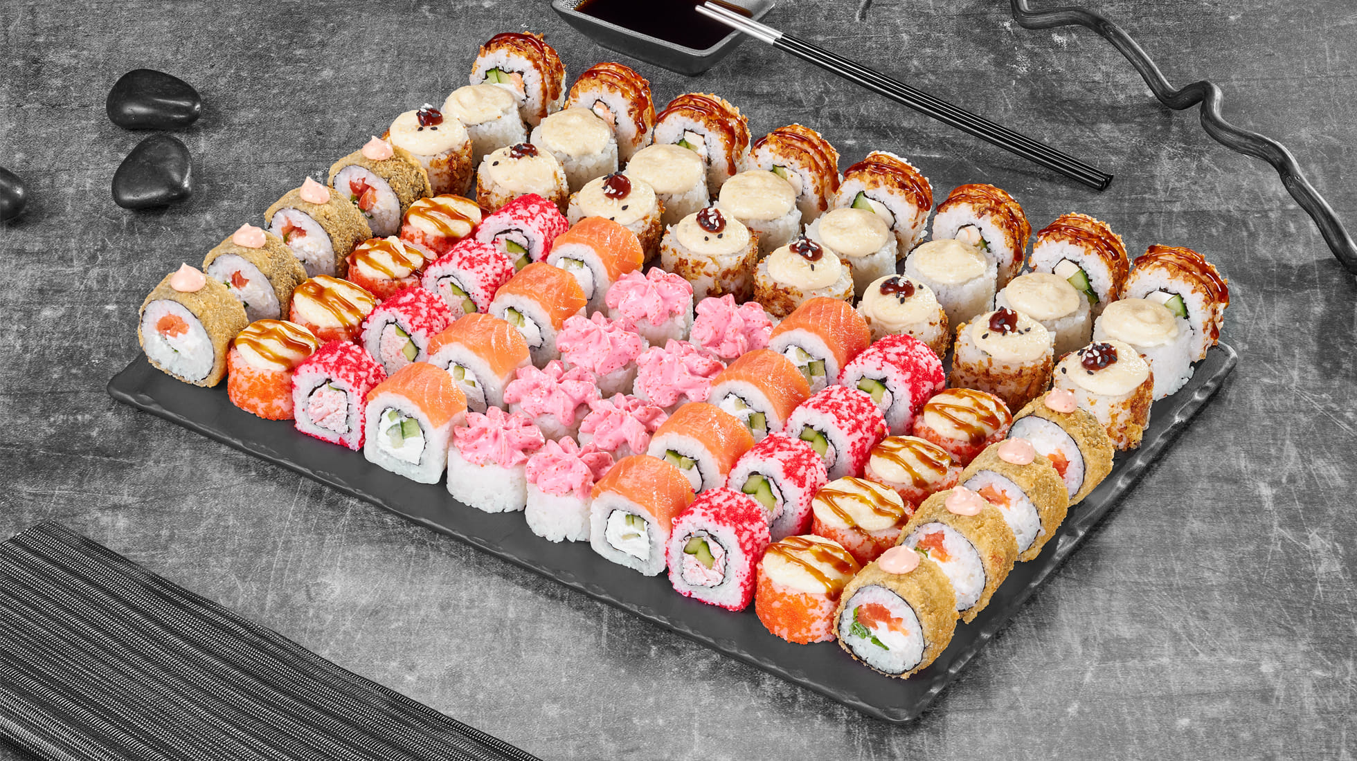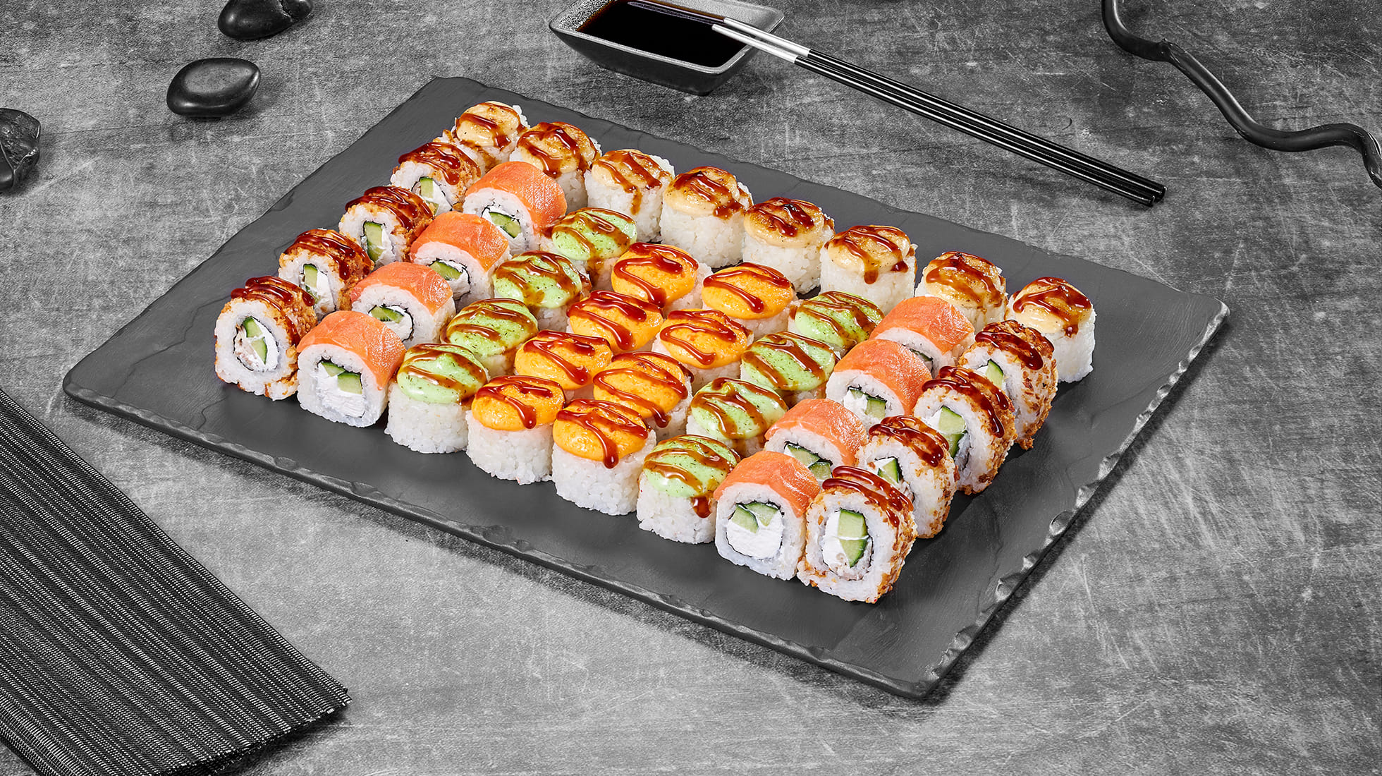 Ролл Филадельфия лайт сяке (8 шт), Ролл Калифорния микс (8 шт), Ролл Мистер барбекю (8 шт), Ролл Лава с креветкой (8 шт), Ролл Чикен темпура (8 шт), Ролл Нежный с курицей запеченный (8 шт), Ролл Сумоку запеченный (8 шт). *Внешний вид блюда может отличаться от фото на сайте.