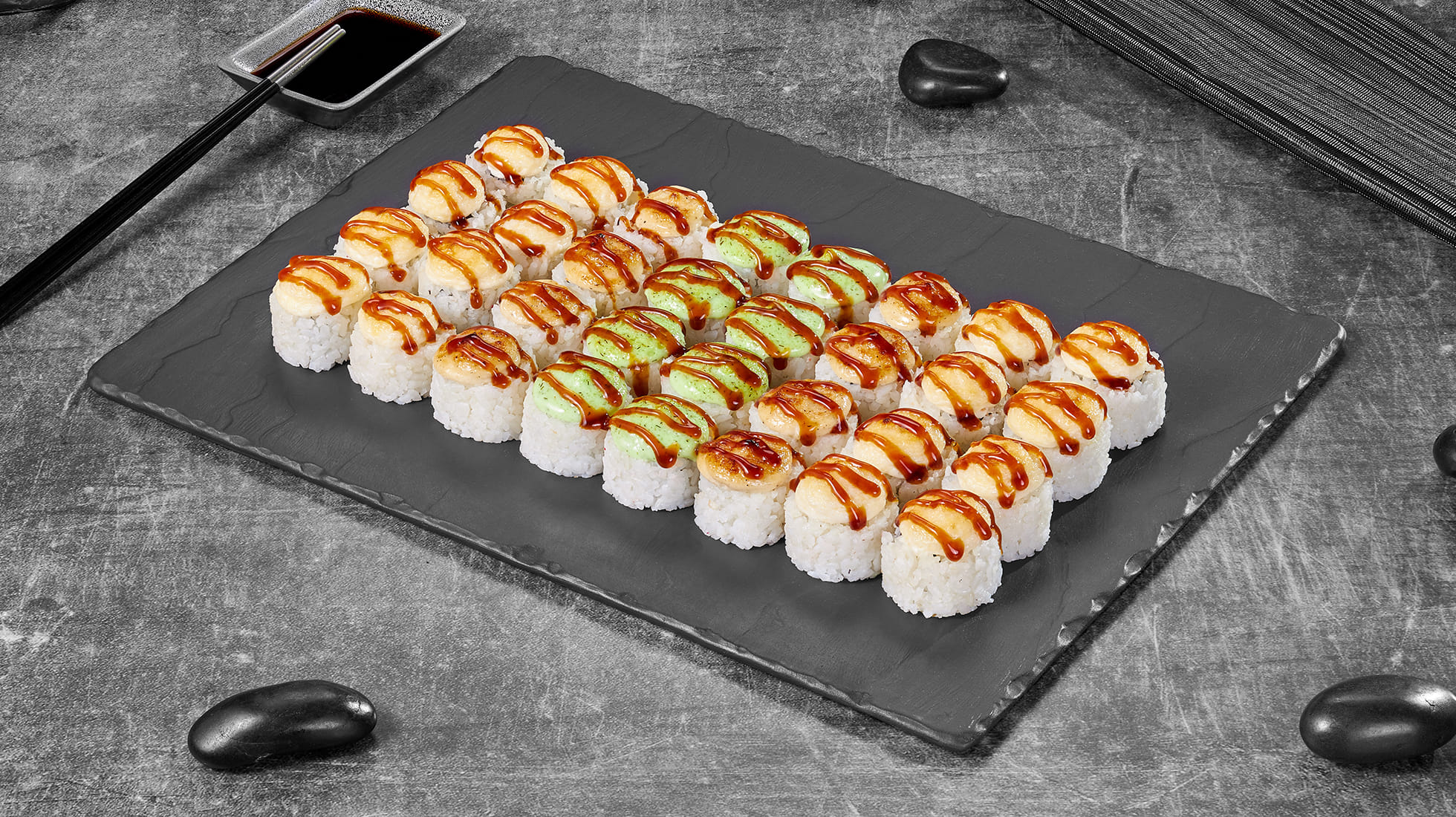 Ролл Филадельфия лайт сяке (8 шт), Ролл Лава с лососем (8 шт), Ролл Калифорния классика (8 шт), Ролл Чикен дон (8 шт), Ролл Лосось фри темпура (8 шт), Цезарь ролл запеченный (8 шт), Ролл Чикен фри хот запеченный (8 шт), Ролл Флешбек запеченный (8 шт). *Внешний вид блюда может отличаться от фото на сайте.