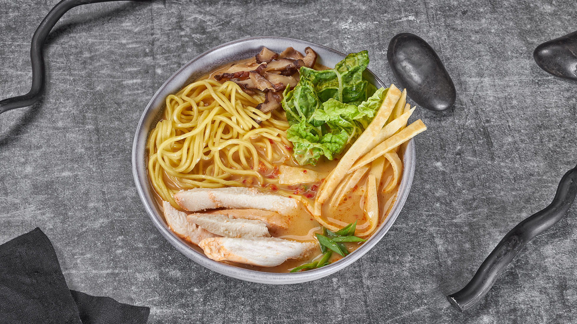 Курица, лапша рамен, блин томаго, капуста пекинская, грибы шиитаке, лук зеленый, бульон том ям *Внешний вид блюда может отличаться от фото на сайте.