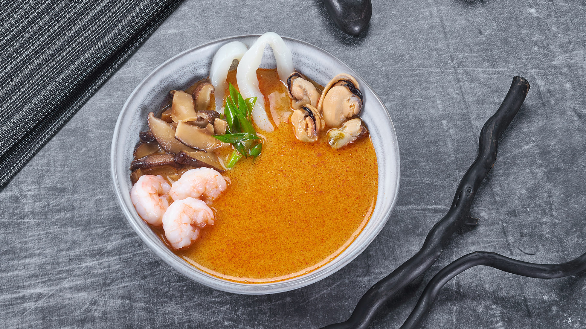 Мидии, кальмар, креветки, бульон том ям, грибы шиитаке, зеленый лук *Внешний вид блюда может отличаться от фото на сайте.