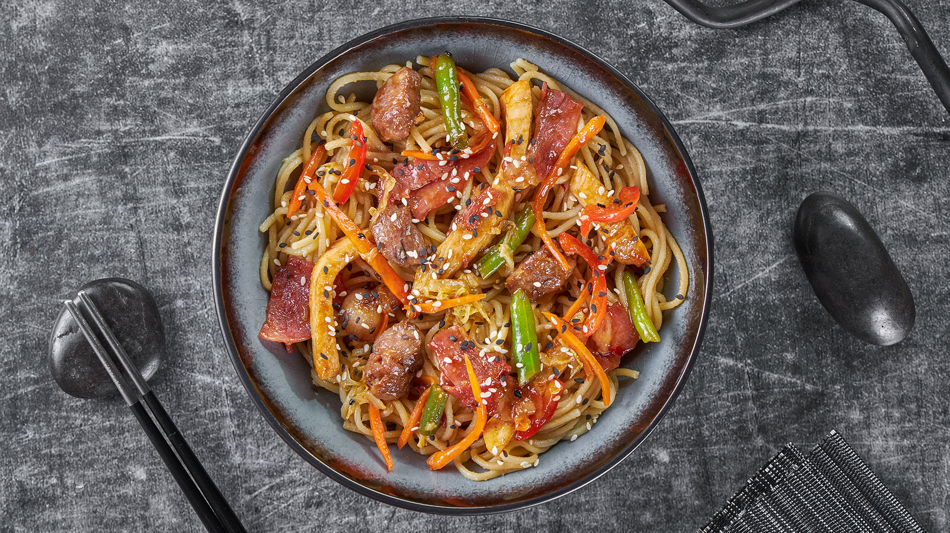 Лапша рамен, курица, говядина, бекон, болгарский перец, морковь, пекинская капуста, стручковая фасоль, репчатый лук, соус вок, кунжут *Внешний вид блюда может отличаться от фото на сайте.