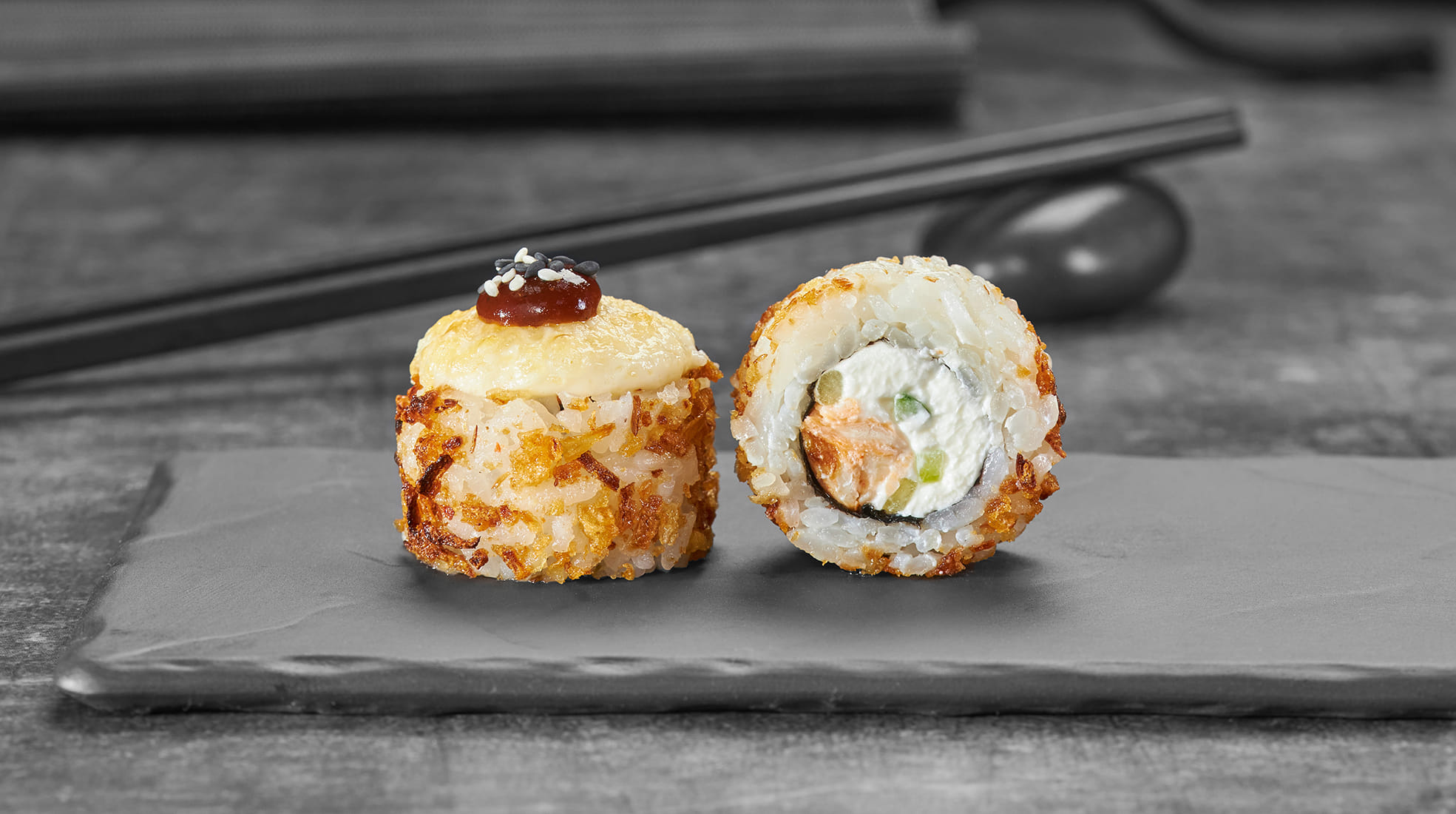 Состав: Курица, крем чиз, огурец, лук фри, монако соус, барбекю соус, кунжут, рис, нори *Внешний вид блюда может отличаться от фото на сайте.