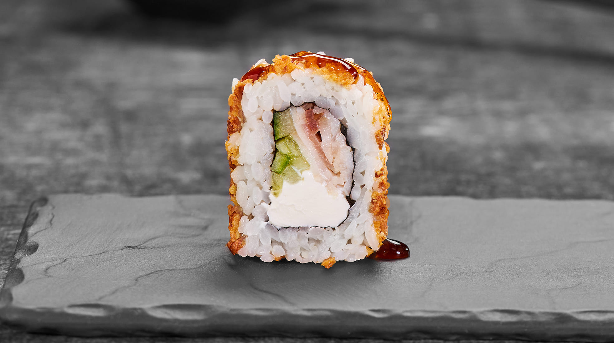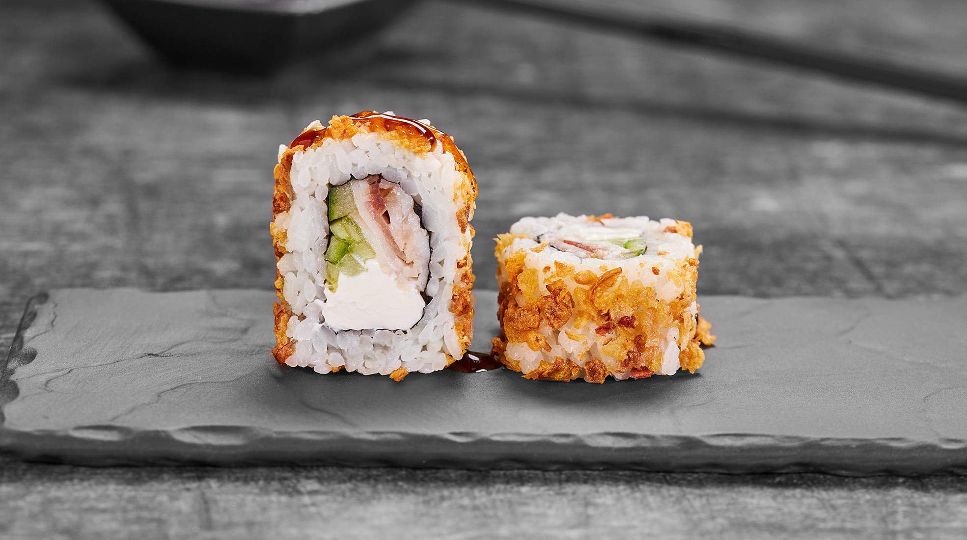 Состав: Бекон, крем чиз, огурец, лук фри, унаги соус, рис, нори *Внешний вид блюда может отличаться от фото на сайте.