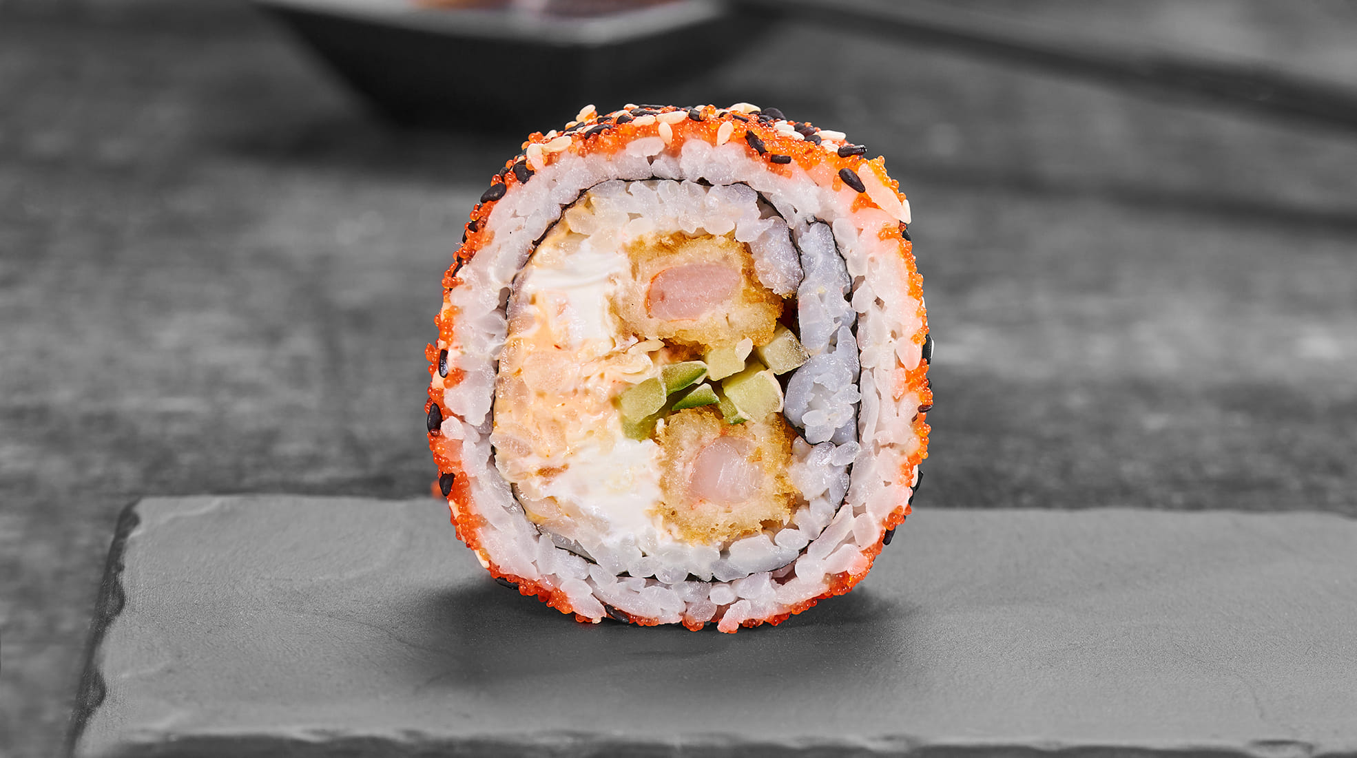 Состав: Креветка в панировке, крем чиз, огурец, краб-микс соус, оранжевая икра масаго, кунжут, унаги соус, рис, нори *Внешний вид блюда может отличаться от фото на сайте.