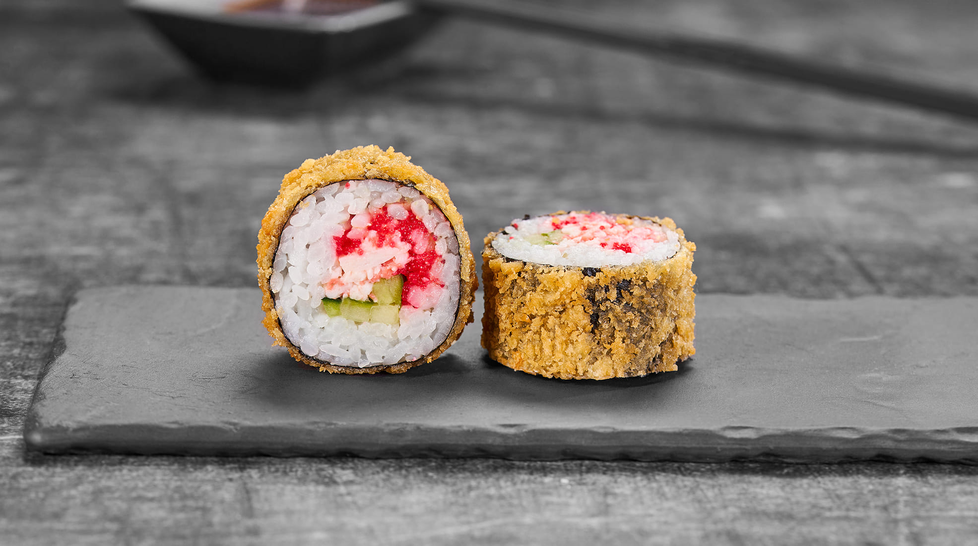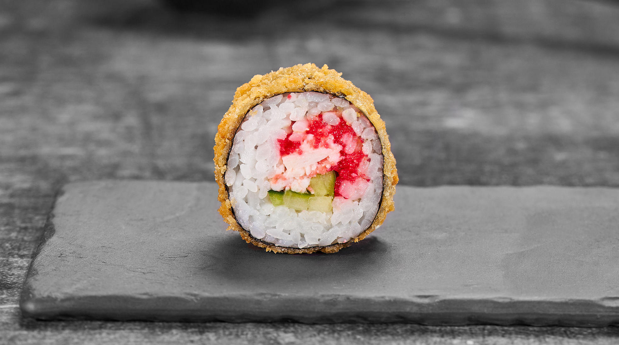 Состав: Краб-микс соус, огурец, красная икра масаго, спайси соус, темпурный кляр, панировочные сухари, рис, нори *Внешний вид блюда может отличаться от фото на сайте.