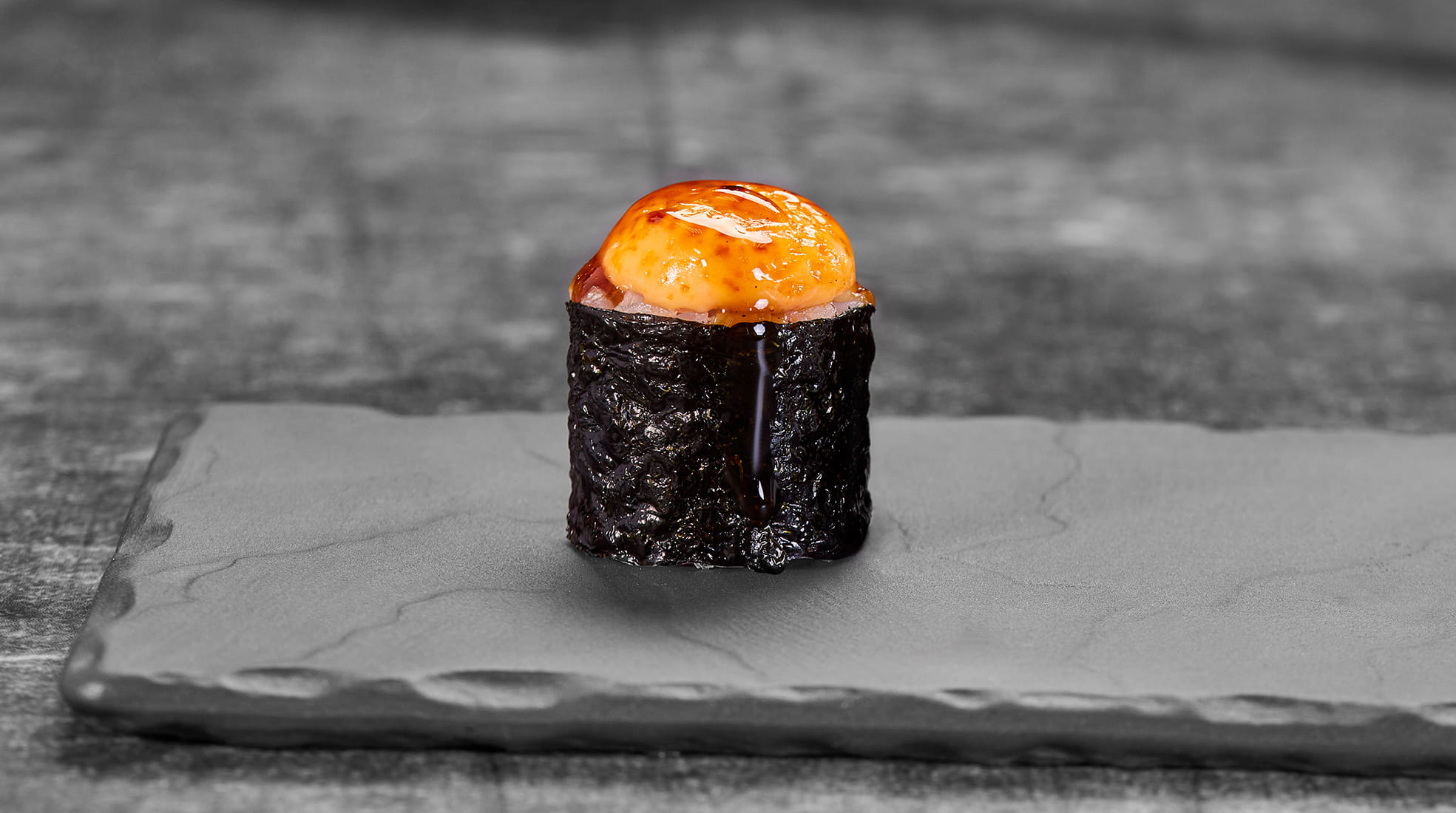 Папарацци сразу узнали знаменитость, но она быстренько спряталась под вкусной шапочкой из соуса яки. Ох уж эта Мидийная личность! Завернулась в нори и была такова! Заказывай и не забудь сделать селфи со звездой ;)