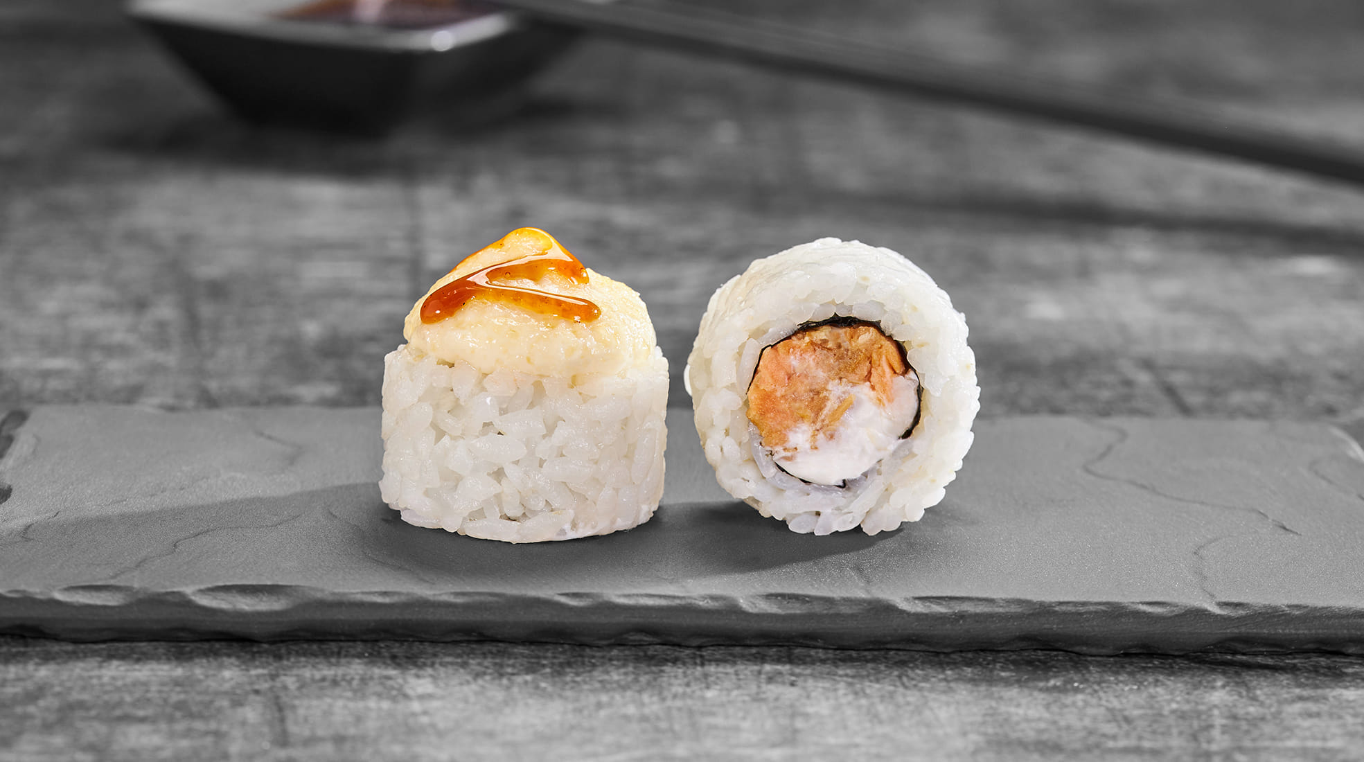 Состав: Лосось терияки, крем чиз, пекинская капуста, унаги соус, монако соус, рис, нори *Внешний вид блюда может отличаться от фото на сайте.
