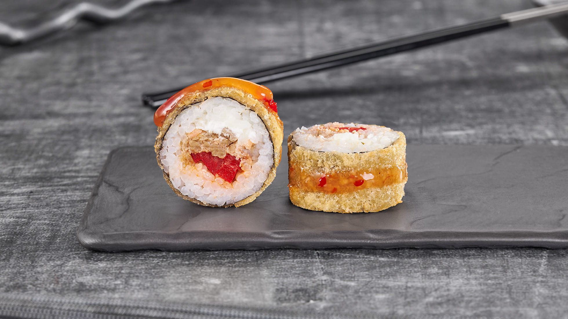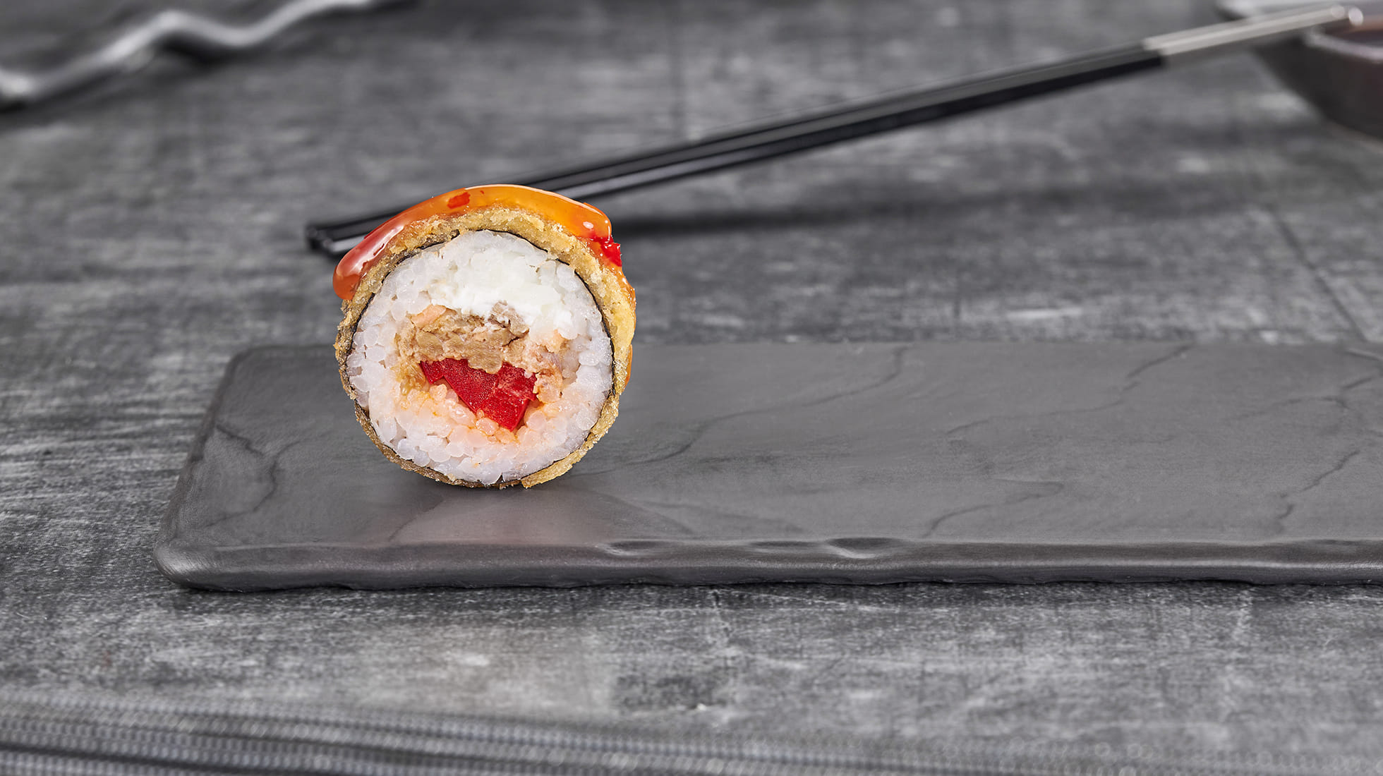 Состав: Лосось терияки, крем чиз, перец болгарский, темпурный кляр, панировочные сухари, сладкий чили соус, рис, нори *Внешний вид блюда может отличаться от фото на сайте.