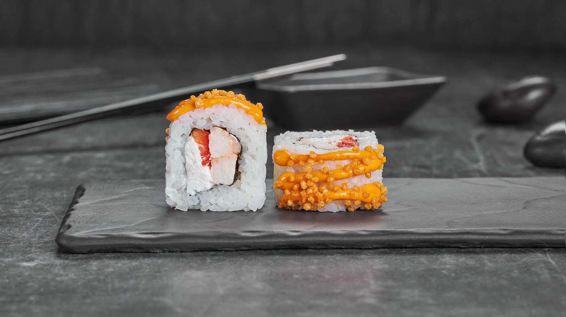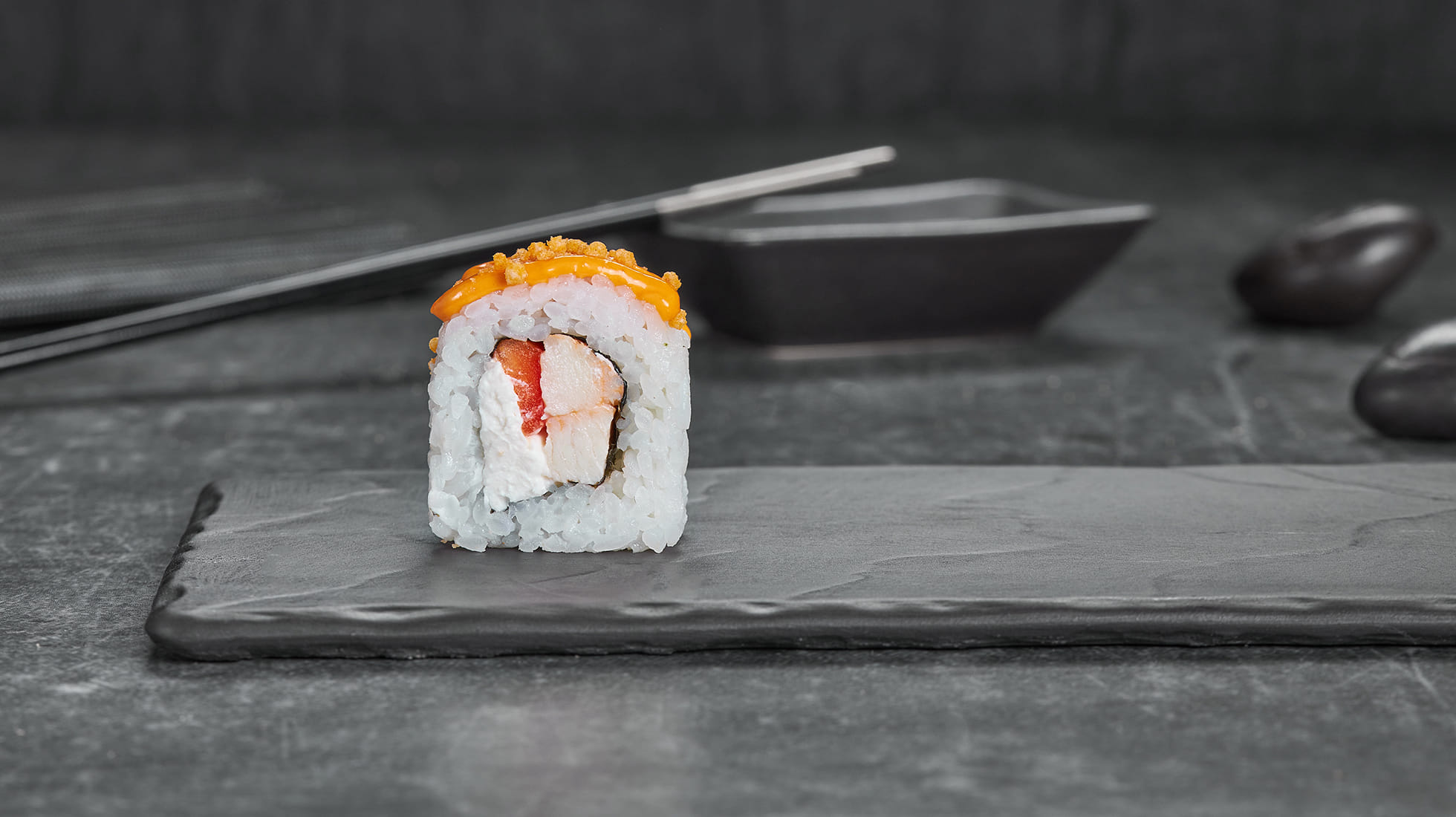 Этот парень зашел без приглашения и сразу устроил вечеринку. Курочка даёт жару, спайси соус подливает огоньку, болгарский перчик хрустит от восторга, а крем чиз делает вид, что всё под контролем. Но следом врываются рисовые шарики… Короче, с этим роллом скучно не будет ;)