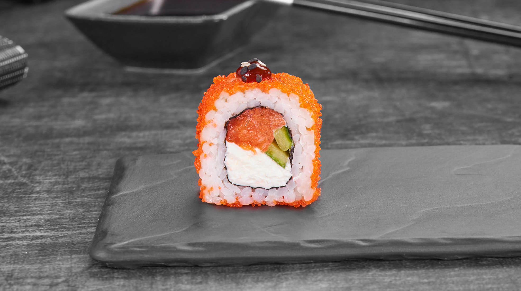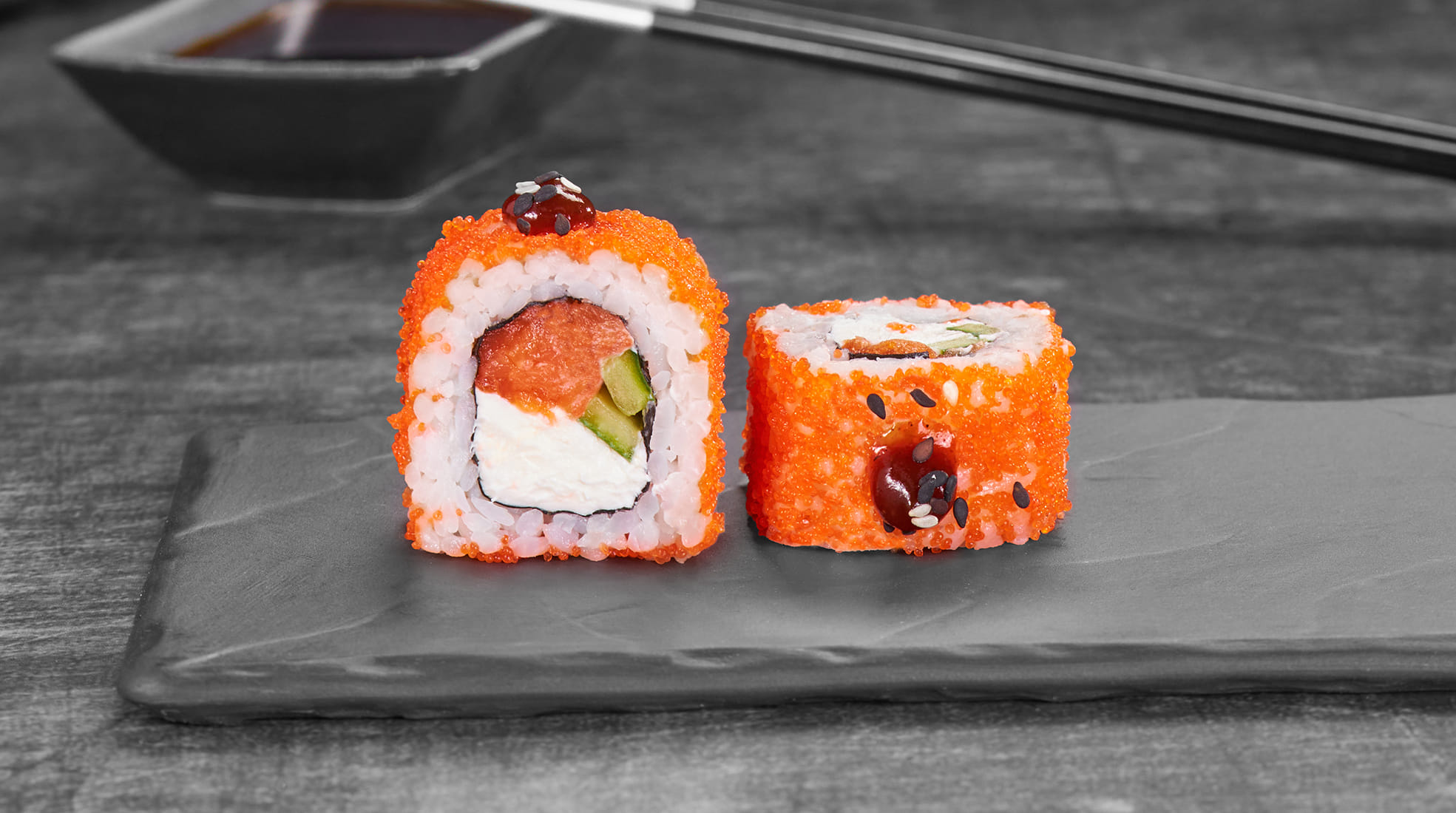 Состав: Копченая кета, крем чиз, огурцы, оранжевая икра масаго, барбекю соус, кунжут, рис, нори *Внешний вид блюда может отличаться от фото на сайте.
