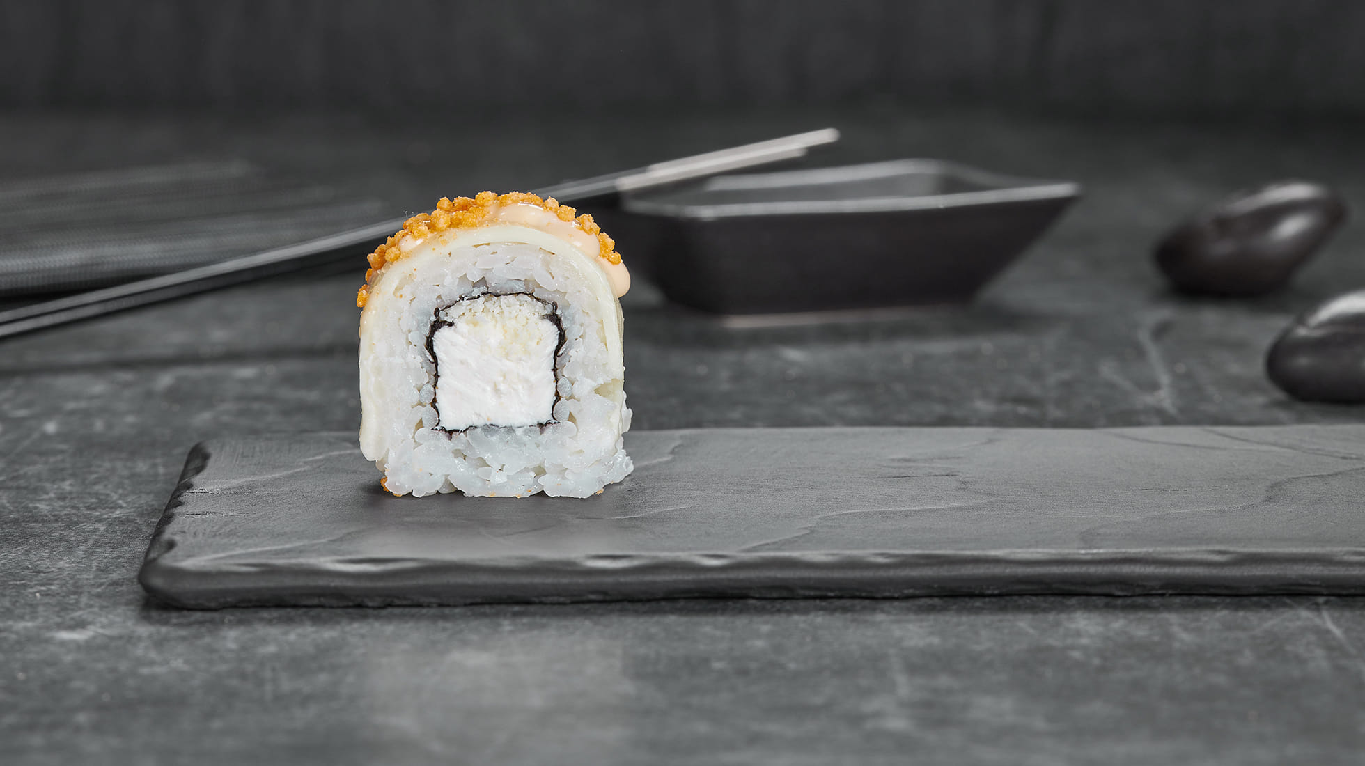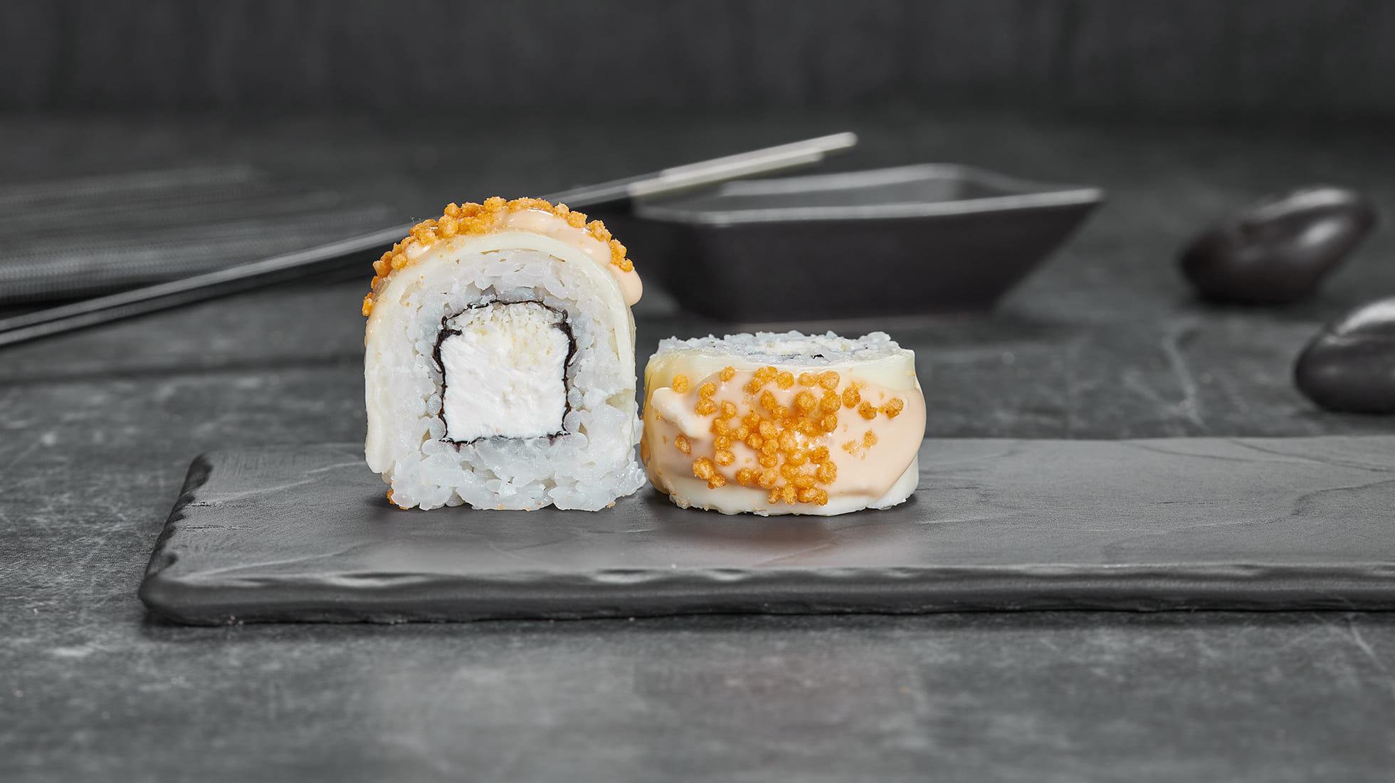 Крем чиз, пармезан и тот самый тягучий сыр устроили настоящее извержение, а рисовые шарики подкинули искру. Японский соус наблюдает за этим с улыбкой, а ты – с палочками в руках. Осторожно, очень аппетитно ;)