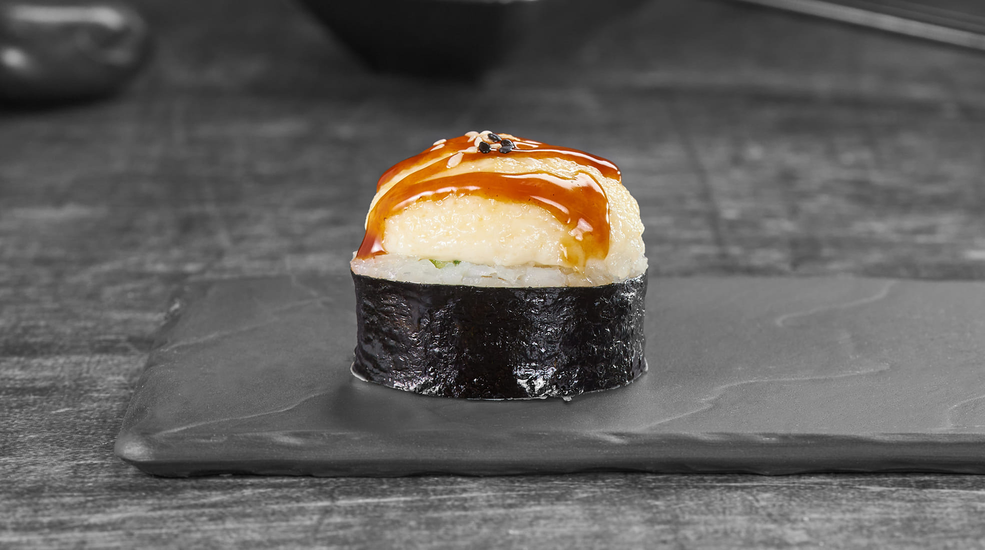 В пафосном ресторане люди, которые не едят грибы, не заказывают Жульен, потому что боятся услышать надменное "Фи" в свою сторону. Хорошо, что мы в Суши Мастер любим немного пошалить и обойти скучные правила. Блин Тамаго, нежная курочка, огурчик для хруста и сочетание авторских соусов - твой персональный Жульен готов ;)